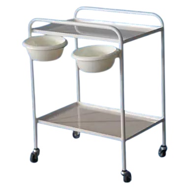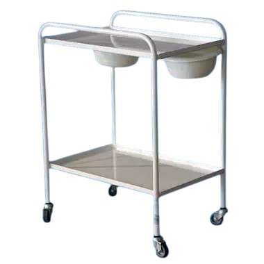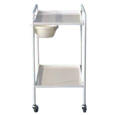 Valge instrumendikäru 2-riiuliga on valmistatud terasest ja kaetud vastupidava pulbervärviga. Seda on lihtne puhastada ja desinfitseerida. Kärul on 360 kraadi pöörlevat neli kummistkattega ratast. Riiulite servad on ülespoole keeratud, et vältida esemete mahakukkumist. Riiulid asetsevad kõrgustel 21,5 cm ja 70,5 cm. Riiuliga on kaasas 2 kallutatavat plastik kaussi.