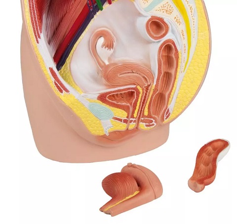 Elusuuruses naise vaagna mudel on mediaan-sagitaalne ja näitab naise vaagnat kolmes osas. Lisaks lihastele ja veresoontele kujutab mudel ka urogenitaalorganeid. Eemaldatavad on emaka, tupe ja põie pool ning üks pool soolestikku koos pärasoolega.