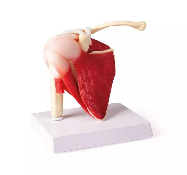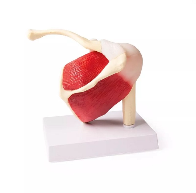 Inimese õlaliiges elusuuruses koos rotaatormanseti lihastega (harjaüline lihas, harjaalune lihas, väike ümarlihas, suur ümarlihas ja abaluualune lihas) ning õlavarre-kakspealihase kõõlus. Liigesel on piiratud liigutatavus. Mudel on alusel.