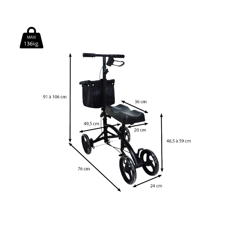 Rulaator põlvetoega on ideaalne tugi kasutajatele, kellel on ajutised käimispiirangud. See võimaldab inimestel kõndida, hoides samal ajal jalga mugavalt põlvest kõverdatud. Toode võimaldab kasutajatel lihtsalt ja ohutult toas või õues ringi jalutada. Rulaator on varustatud piduriga, mis lukustab mõlemad tagarattad korraga. Kokkupandav hõlpsaks hoiustamiseks. Lihtne pidur ja seisupidur. Alumiiniumraam ja libisemiskindlad 20 cm läbimõõduga rattad.