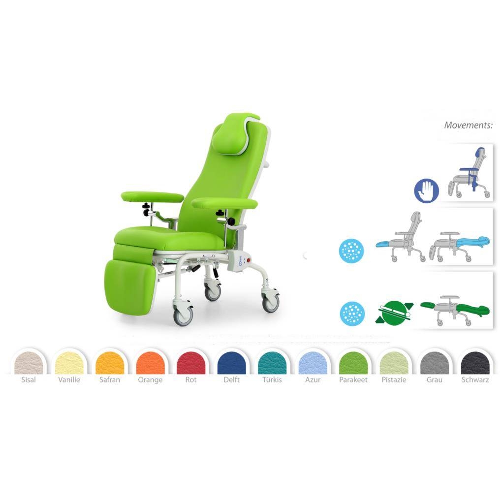 Fikseeritud istme kõrgusega protseduuritool on mehaaniliselt reguleeritav ratastega tool, mis sobib haiglatesse, kliinikutesse, perearstikeskustesse ja mitmetesse teistesse raviruumidesse. See on mõeldud patsientide uuringute läbiviimiseks, meditsiiniliste toimingute ja protseduuride läbiviimiseks, verevõtuks, muude arstlike läbivaatuste tegemiseks. Protseduuritool on valmistatud terasprofiilidest ja torudest, kaetud pulbervärviga, vastupidav UV-kiirgusele, desinfektsiooni- ja pesuvahendite mehaanilistele kahjustustele. Protseduuritoolil on 4 ratast, millest 2 tagumisel on pidurid. Seljatoe taga on käepide tooli lihtsaks liigutamiseks. Peatoe kõrgus on reguleeritav. Soovi korral saab lisada tilgutihoidja, paberrullihoidja, läbipaistvast plastikust jalatoe kaitse, hapnikuballooni hoidik, reguleeritavad jalatoed. Istmesegmendid, seljatoed ja käetoed on kaetud antibakteriaalse, mittesüttiva polsterdusega. Selja- ja jalatoe kaldenurga reguleerimine toimub gaasivedru abil (sõltumatult, saadaval ka sünkroonis reguleeritavad). Käetugede kõrgus on reguleeritav. Saadaval erinevates polstrikatte värvitoonides.