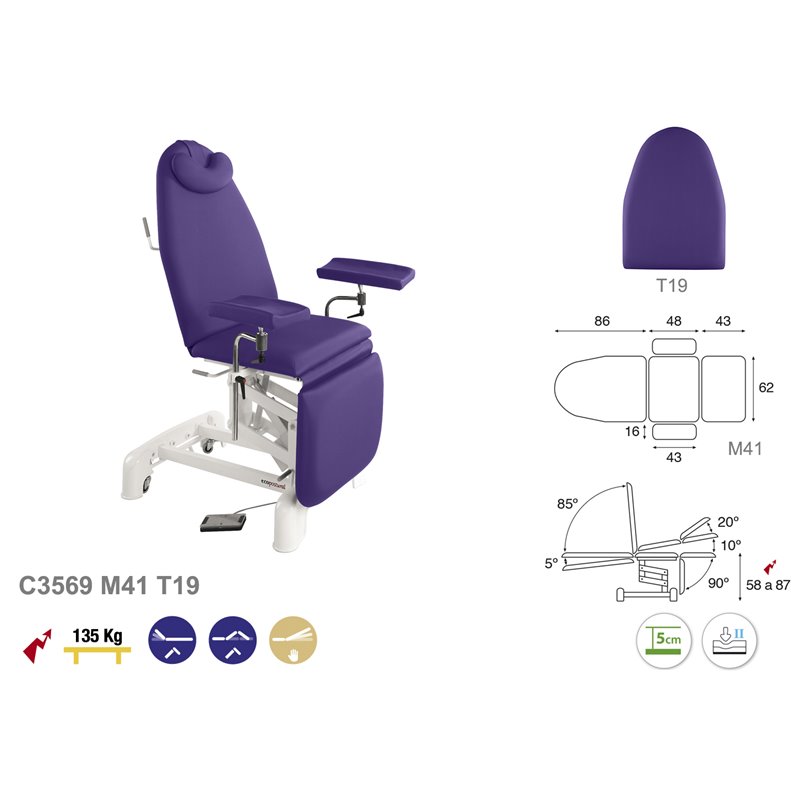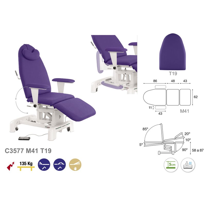 3-osaline elektriline protseduuritool. Tooli raam on valmistatud metallist ja kaetud valge värviga. Tooli kõrgus on reguleeritav elektriliselt jalapedaaliga. Pea- ja keskosa on reguleeritavad hüdrauliliselt. Jalaosa reguleeritav manuaalselt. Toolil on rattad toote kergeks liigutamiseks ühest ruumist teise. Lamamisosa on polsterdatud ja kaetud kergesti puhastatava ja desinfitseeritava vinüülkattega. Toode on saadaval erinevate käetugedega. Lisana võimalik saada peaosasse näo ava ja lisapadi. Saadaval 25 erinevas värvitoonis. Pildil olev lisapadi ei kuulu komplekti.