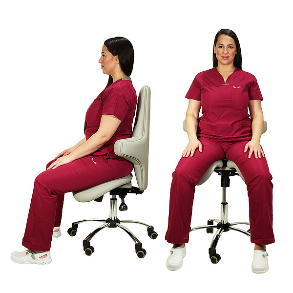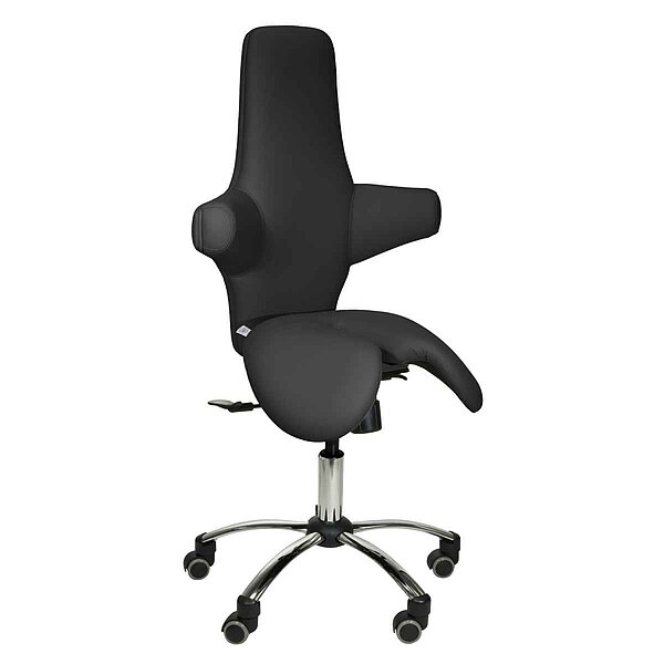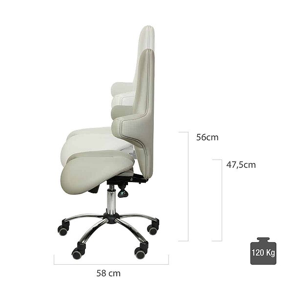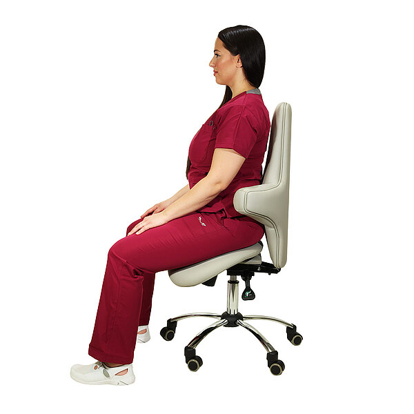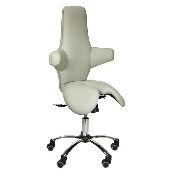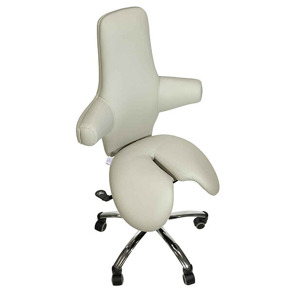 Kõrge seljatoega ergonoomiline sadultool pakub mugavust ja seljasõbralikku istet meditsiinipraksistes või kabinettides. Lisaks ergonoomilise kujuga istmele eristub toolil hästi polsterdatud multifunktsionaalne seljatugi. Sadultoolil on istme kõrguse reguleerimine vahemikus 47,5 – 57,5 cm. Istumise mugavuse parandamiseks saab kiikmehhanismiga varustatud seljatuge reguleerida kas fikseeritud nurga alla või liikuda dünaamiliselt. Kergesti hooldatav kunstnahast kate on saadaval erinevates värvitoonides. Inimestel, kes on pikemad kui 1,85 cm, soovitame kasutada suuremat gaasivedru (artikkel 145325). See võimaldab istme kõrgust reguleerida vahemikus 57,5-77,5 cm.