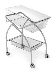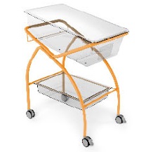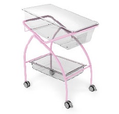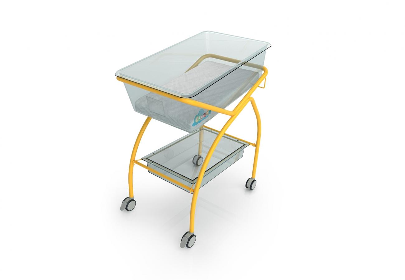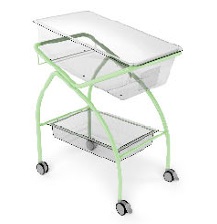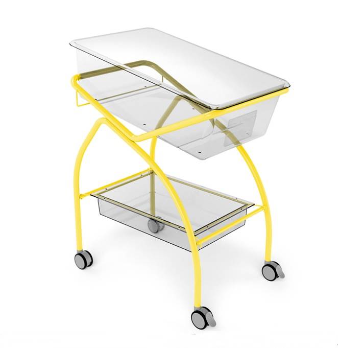 Kallutatav fikseeritud kõrgusega vastsündinute voodi, mille konstruktsioon on valmistatud epoksüpulbervärviga kaetud terastorudest.
