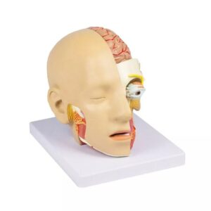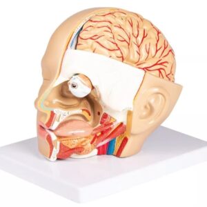 Elusuuruses inimese pea mudel 4 osas. Näo vasak pool on tükeldatud sagitaalses ja horisontaalses osas, millel on palju kolju ja